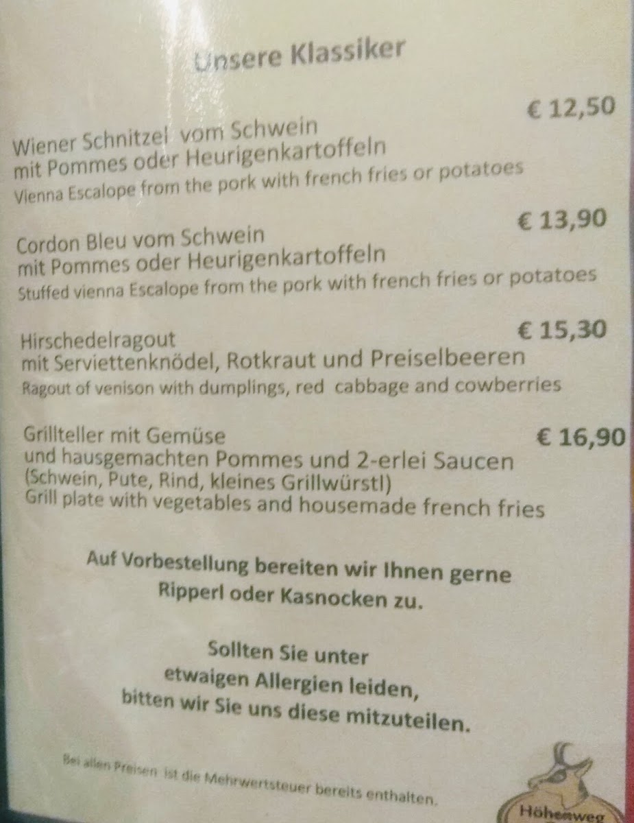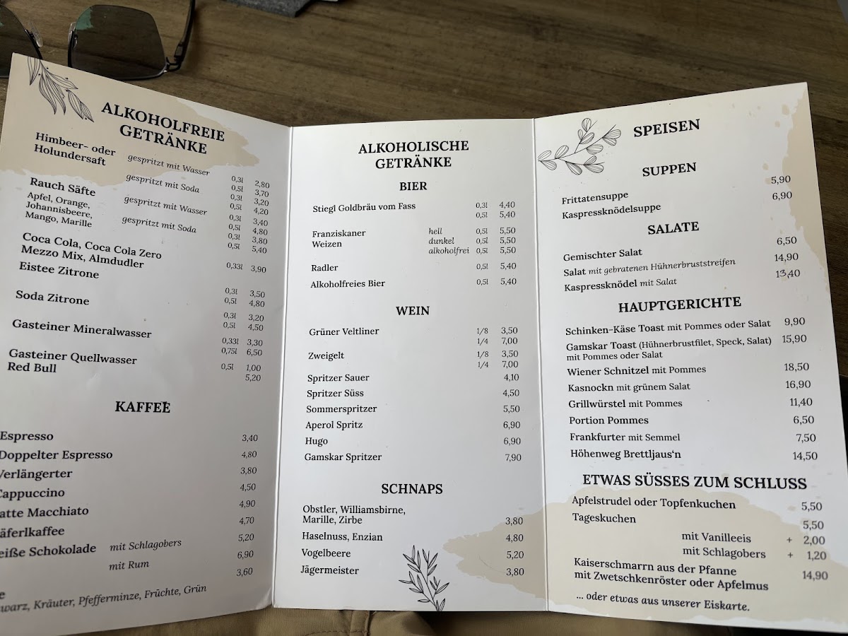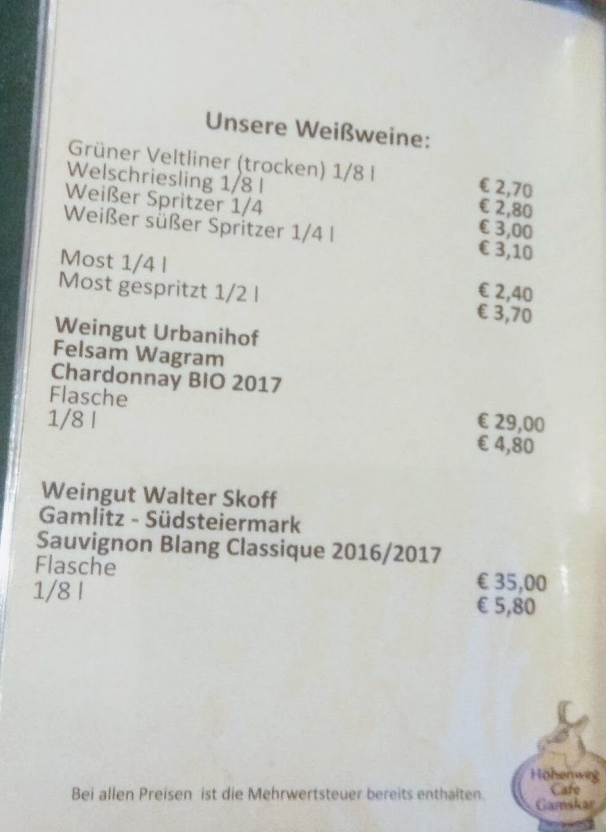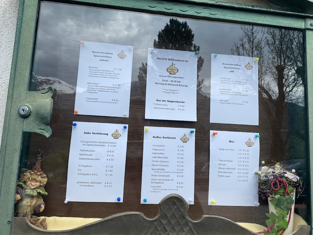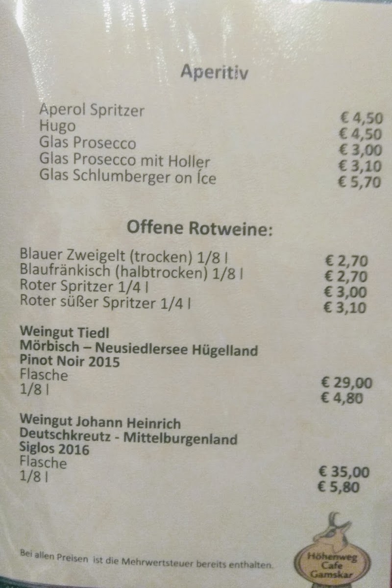 The menu at Höhenweg Cafe Gamskar offers a variety of options suitable for casual dining, light meals, and coffee breaks. Visitors can expect traditional Austrian cafe fare alongside a selection of beverages and desserts.