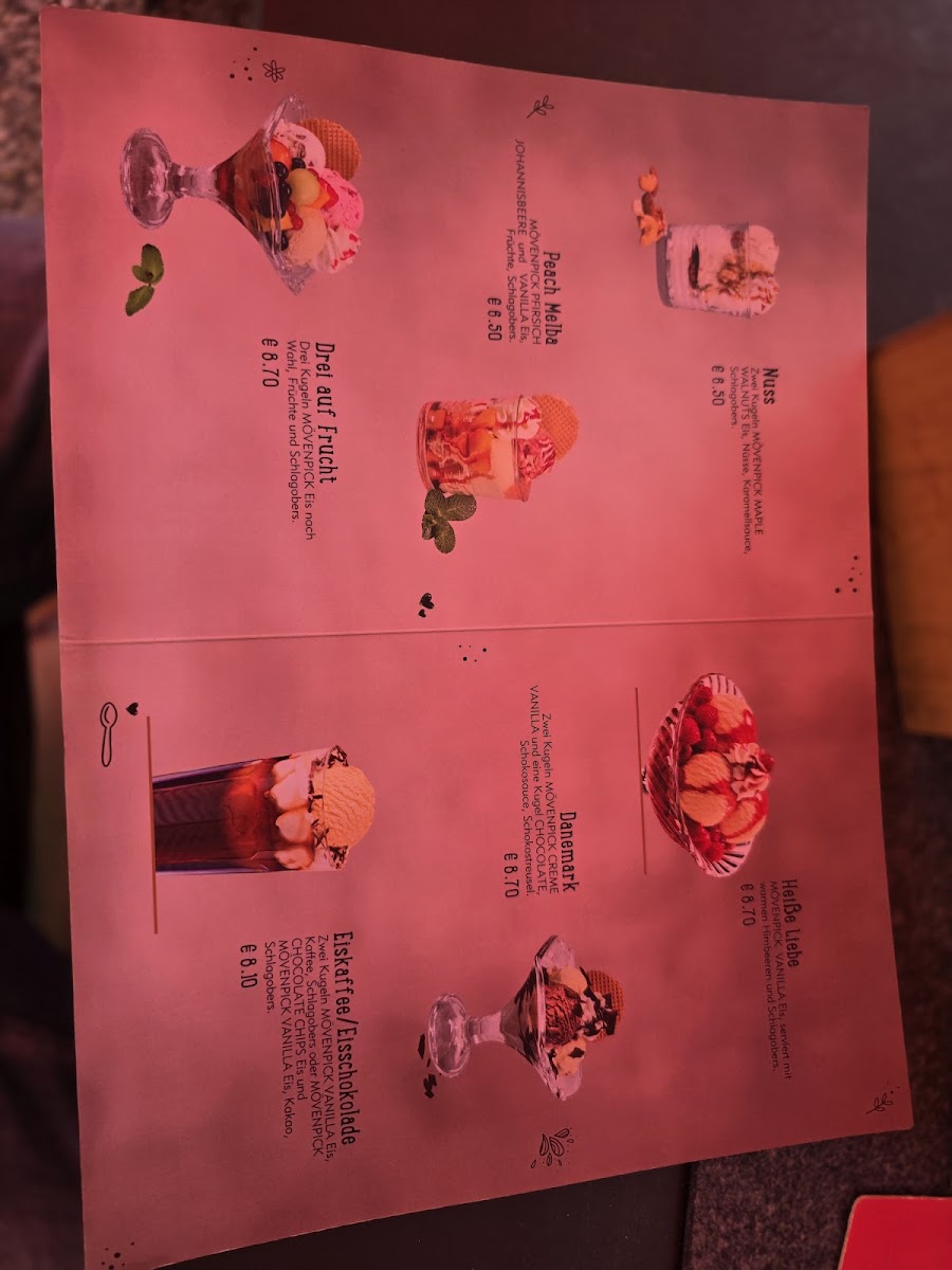 On the beverage side, the menu features a range of coffees along with various beers including Weizenbier and Waissenbier, catering to those seeking traditional local drinks. Desserts such as Erdbeeren mit Vanilleeis complement the drink selections, making the menu well-suited for afternoon coffee and cake.